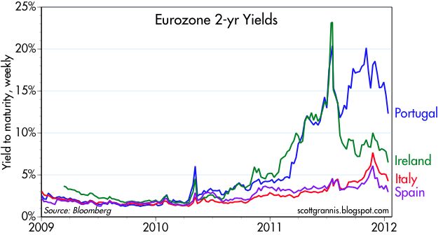 Not surprisingly, Spain and Italy today had successful bond auctions that resulted in a significant decline in yields. With the exception of Greece, where 2-yr yields have soared to 170%, 2-yr yields in Portugal, Ireland, Italy and Spain haven't been this low for many months; Irish yields are back down to levels not seen since last February. With improved liquidity comes improved confidence, and with improved confidence, markets can function more normally and economic growth is less likely to suffer. All very positive developments.