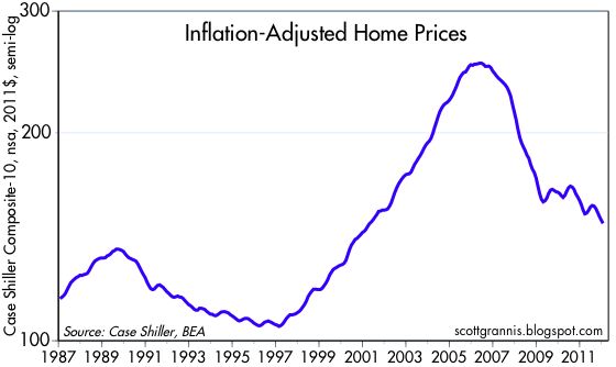 The stock market figured this out long ago. Homebuilders' stocks are up 160% from their recession lows; and REITS have returned 240% since the market bottomed in early March 2009, about double the 123% total return on the S&P 500. In short, housing prices are a terribly misleading picture of the dynamic that has been playing out in the market for the past several years. Prices are way down, to be sure, but that is the way the market deals with an excess inventory of housing. Housing prices are now incredibly affordable, and the excess inventory has been completely worked off in at least several markets around the country. It won't be long before bidding wars start erupting in nearly every market, and when the news of rising home prices finally makes the headlines, there could be a buying stampede.
