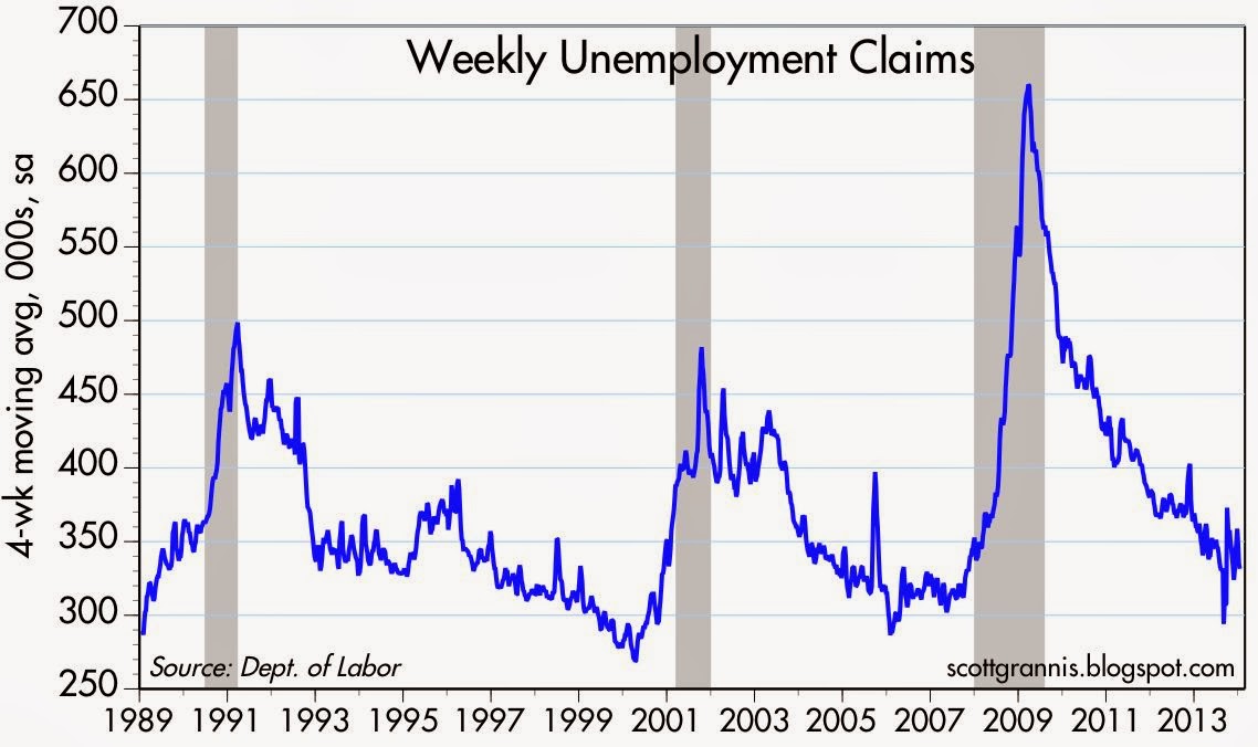 On a seasonally-adjusted basis, first-time claims for unemployment are running about 325K per week and trending slowly down. It doesn't get a whole lot better than this, to judge from prior economic cycles.
