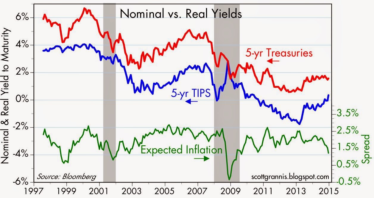 The bond market's energetic response to a quickening in the pace of economic activity has gone largely unnoticed, however, because—thanks to plunging oil prices—inflation expectations have declined by almost 1% since June. As the chart above shows, nominal yields have been flat while real yields have risen: last June, the expected rate of inflation embodied in 5-yr TIPS and Treasury prices was 2.14%, and today it is 1.23%. Don't look at nominal yields, look at real yields if you want the "real" story. Real yields are increasing because growth expectations are firming. Nominal yields are not increasing (and in the case of 10-yr Treasury yields, they have fallen by 50 bps since June) because inflation expectations have fallen.