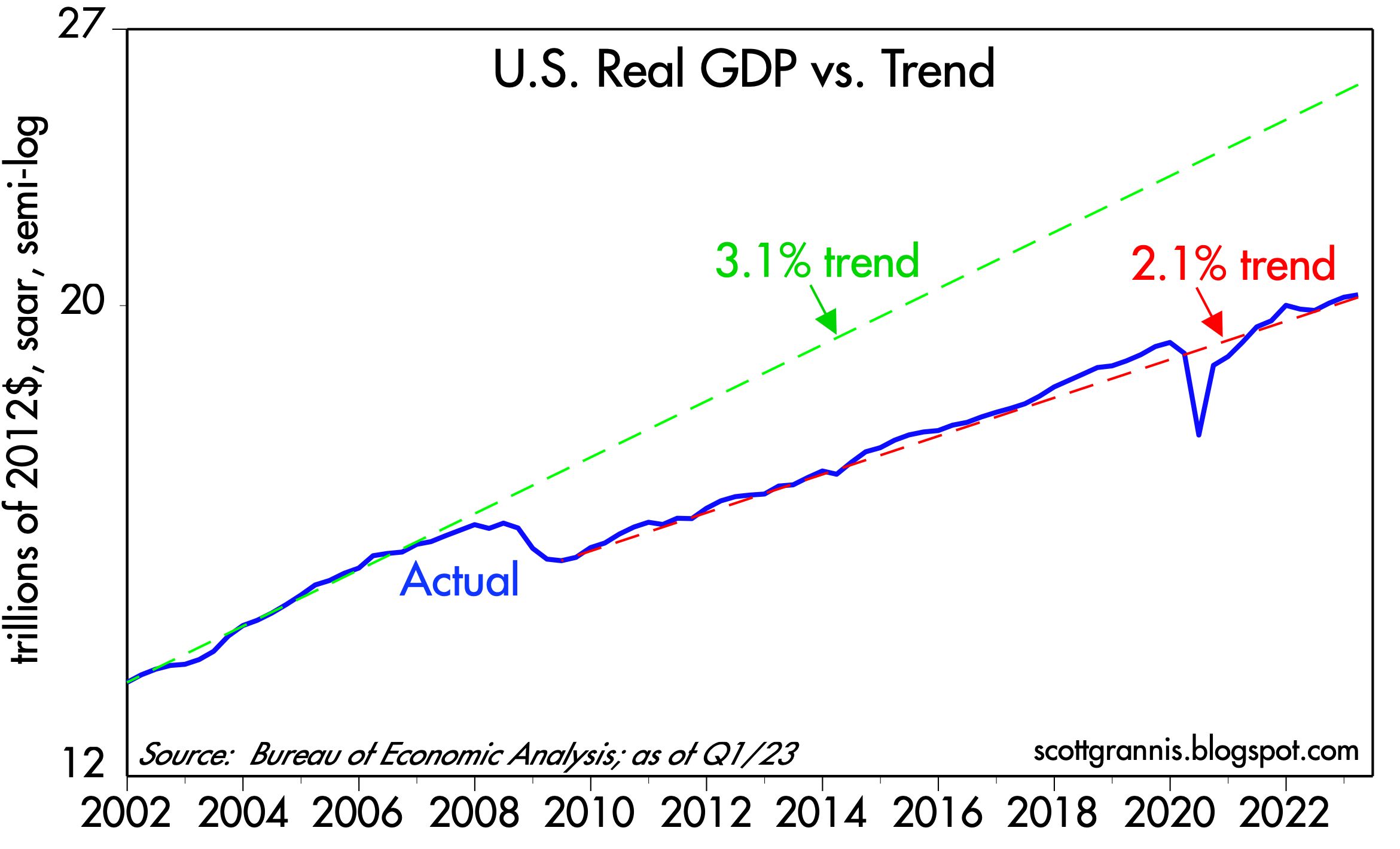 Yes, annualized growth in GDP fell from a 2.6% rate in the fourth quarter to a 1.1% rate in the first quarter, but those are annualized figures which magnify the actual change in the quarterly levels. Note how you can hardly see this change in the blue line on the chart. Moreover, the mini-recession that supposedly happened in the first half of last year is just a wiggle on this chart. The broad growth trend remains about 2%.